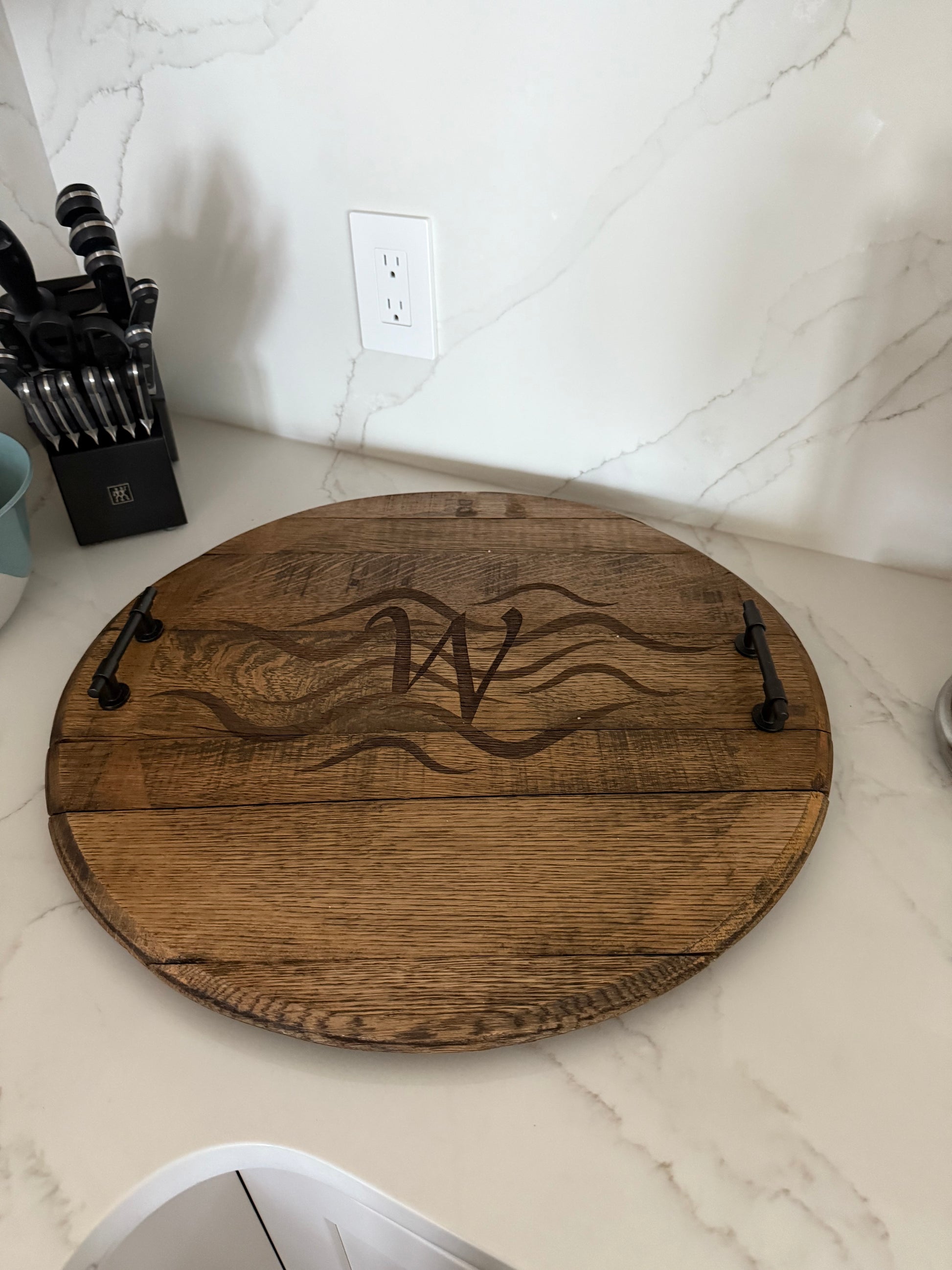 This charcuterie board is made from an authentic whisky barrel lid, and engraved with your unique logo. I will design 3 unique logos and give you the choice of which one you want engraved on the board. The logo you choose will be yours and I will not use it for anyone else. If you already have a logo or monogram and want that engraved on the board, I can do that instead. The boards are stained and food safe. Board is 21" in diameter.